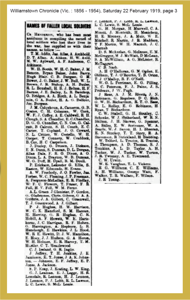 The Sons of Williamstown Project would like to acknowledge the gracious assistance of the Hobsons Bay community and many local organisations, as well as the kind generosity of relatives with close connections to the Honour Board who shared family information. Thank you.